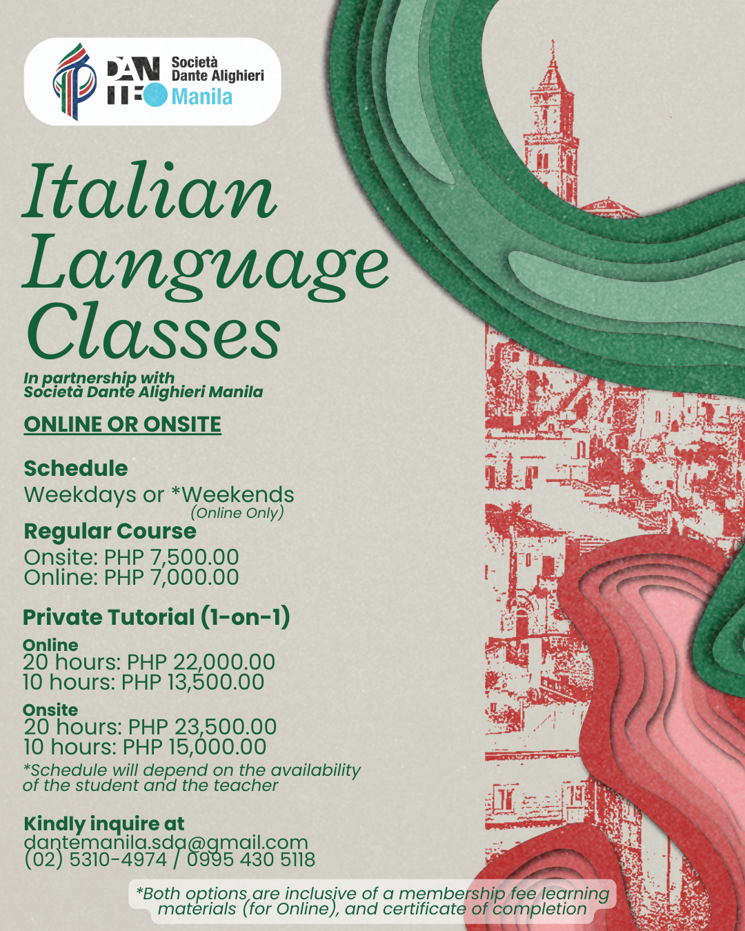 The Philippine-Italian Association offers Italian and Filipino language courses conducted by highly-qualified instructors.